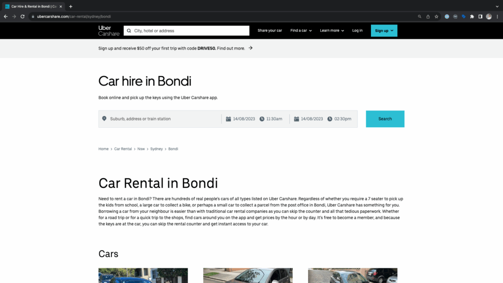 The screenshot below shows another example of some SEO content this time on the Uber Car Share website. I worked as SEO lead for the company shortly before they were acquired by Uber, and managed a large project to completely overhaul the website which resulted in a more-than-doubling of organic traffic, and top-3 rankings for all the most important keywords like 'car hire sydney' etc. Whilst there were many optimisations made to the site structure, internal linking and performance, I believe that the long-form content on each of the landing pages was also an important factor that led to the amazing results.