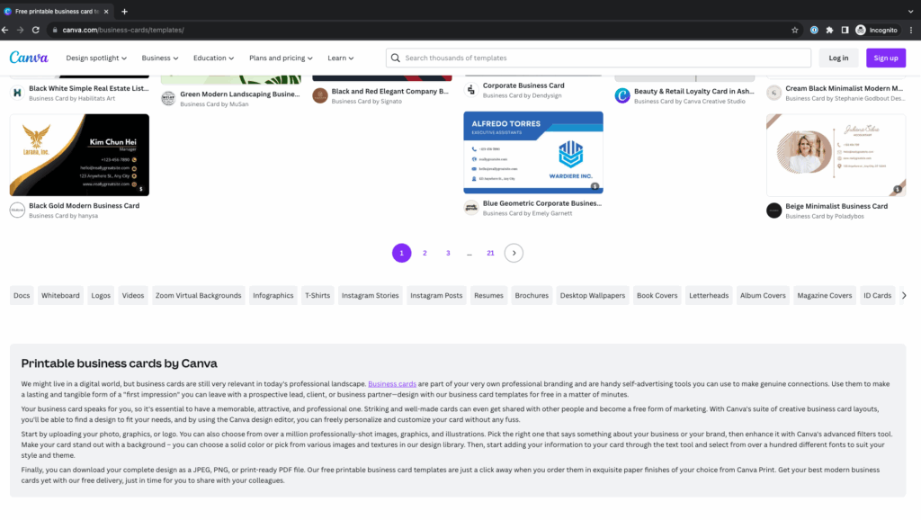 One of the projects I led during my time as international SEO lead at Canva was the launch of the 'templates marketplace' in a number of international locales. In the screenshot below you can see an example of the long-form SEO content on the Business Cards templates page.